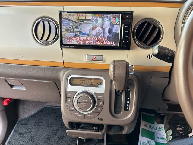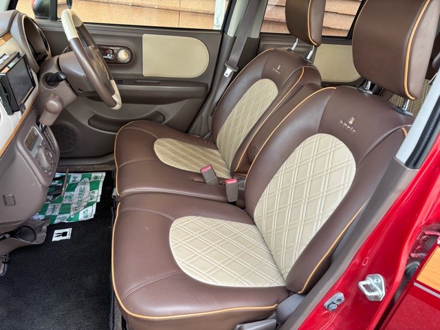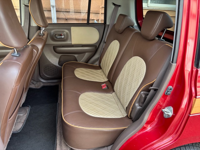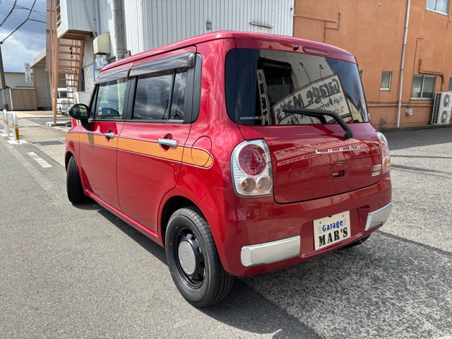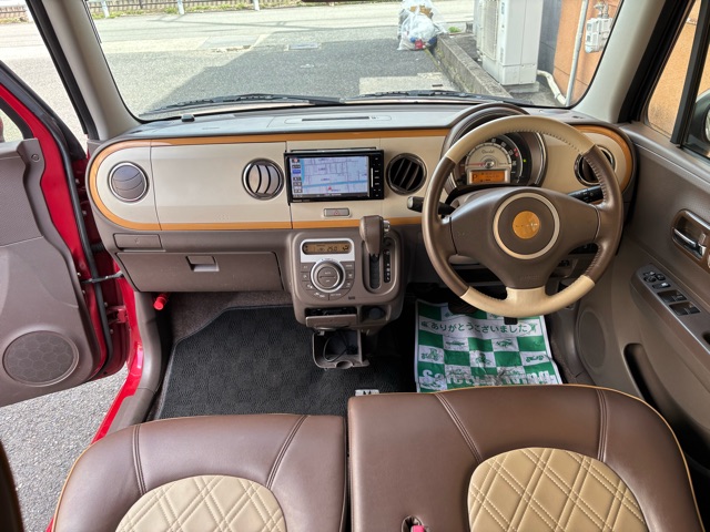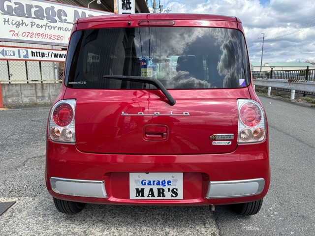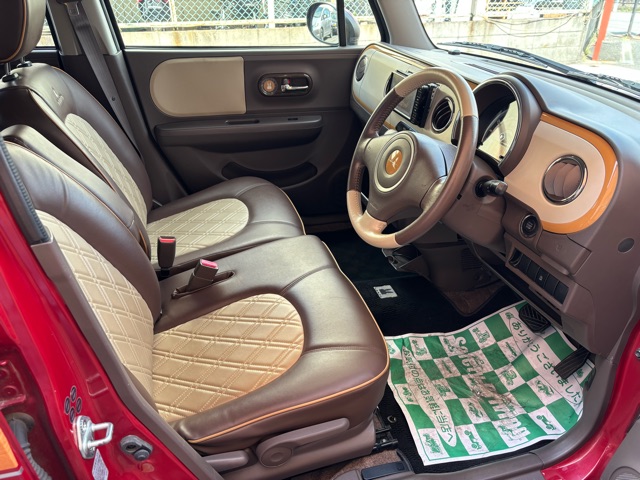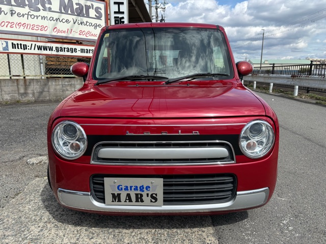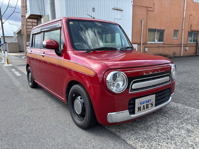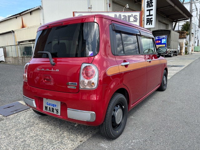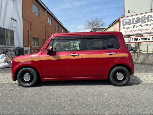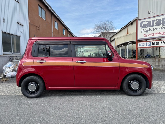 ラパンショコラの入庫です。 ローダウン、ウッドデカール施工、リボンタイヤでオールド感ある可愛いスタイルにしました。 エアコン修理、CVTFフルター類交換済みです。(^^)